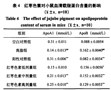 載脂蛋白可以融合和運送血糖到人體各機構開(kāi)展新陳代謝及運用,ApoA1是密度高的蛋白的具體構造和功能蛋白成份,是主動(dòng)脈粥樣硬化和心肌梗塞的保障因素,而ApoB含密度低蛋白數最多,是心肌梗塞的風(fēng)險源,與主動(dòng)脈粥樣硬化、心肌梗塞的發(fā)病率呈成正比。大棗黑色素對小白鼠血清蛋白載脂蛋白成分的干擾如表4所顯示,與空白試驗組對比,高脂肪組小白鼠血清蛋白ApoA1成分降低54.84%,ApoB成分上升45.67%(p<0.01),說(shuō)明高脂肪飲食搭配能使小白鼠患主動(dòng)脈粥樣硬化和心肌梗塞概率提升。給與大棗黑色素干涉后,中、高使用量組小白鼠血清蛋白ApoA1成分上升50%、78.57%,小劑量組實(shí)際效果差別不明顯(p>0.05),低、中、高使用量組ApoB成分降低3.71%、6.17%、20.37%(p<0.05),且呈一定的量效關(guān)聯(lián),說(shuō)明大棗黑色素能危害血糖新陳代謝和運用,改進(jìn)脂代謝混亂,從而危害高血脂、主動(dòng)脈粥樣硬化等病癥的產(chǎn)生。